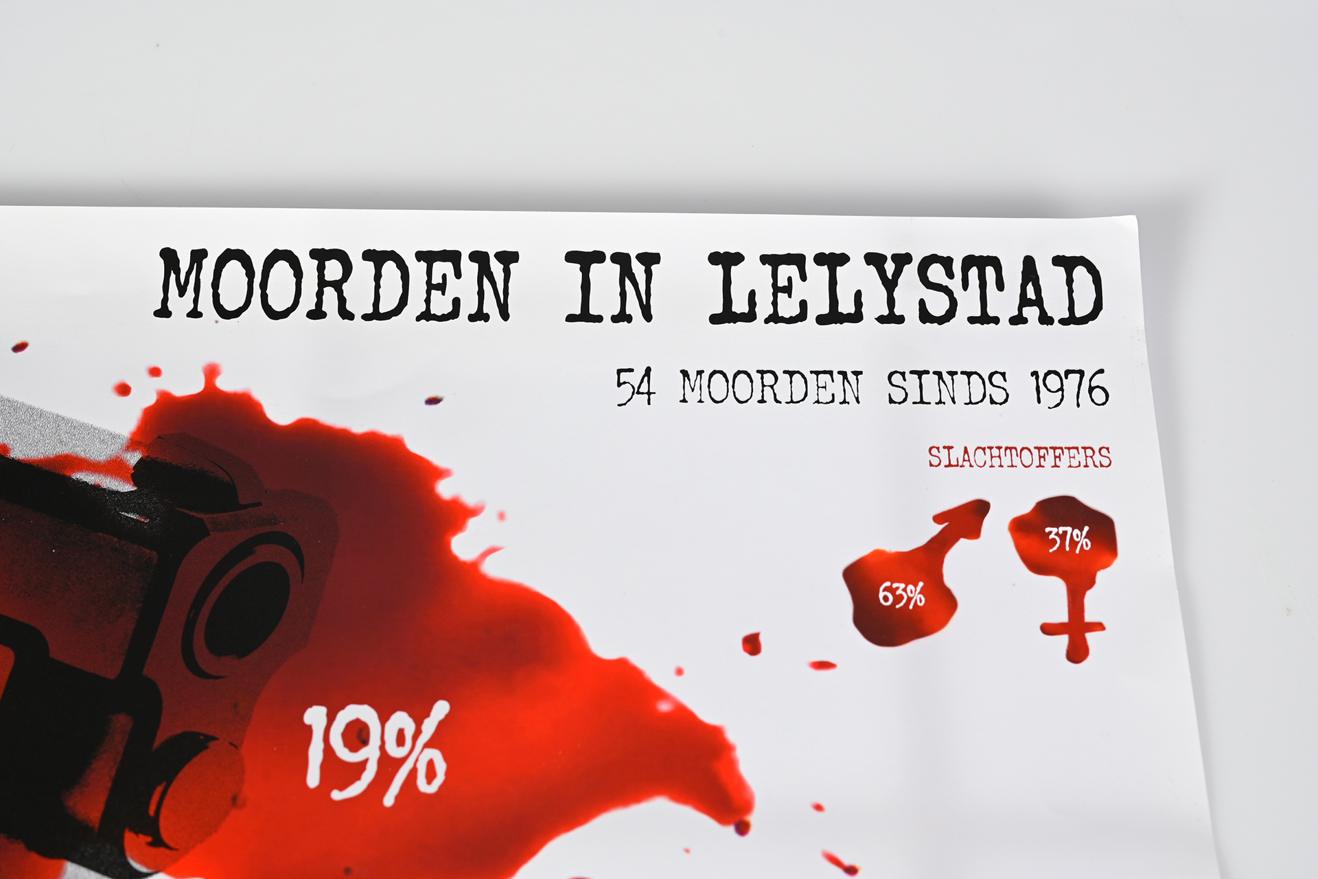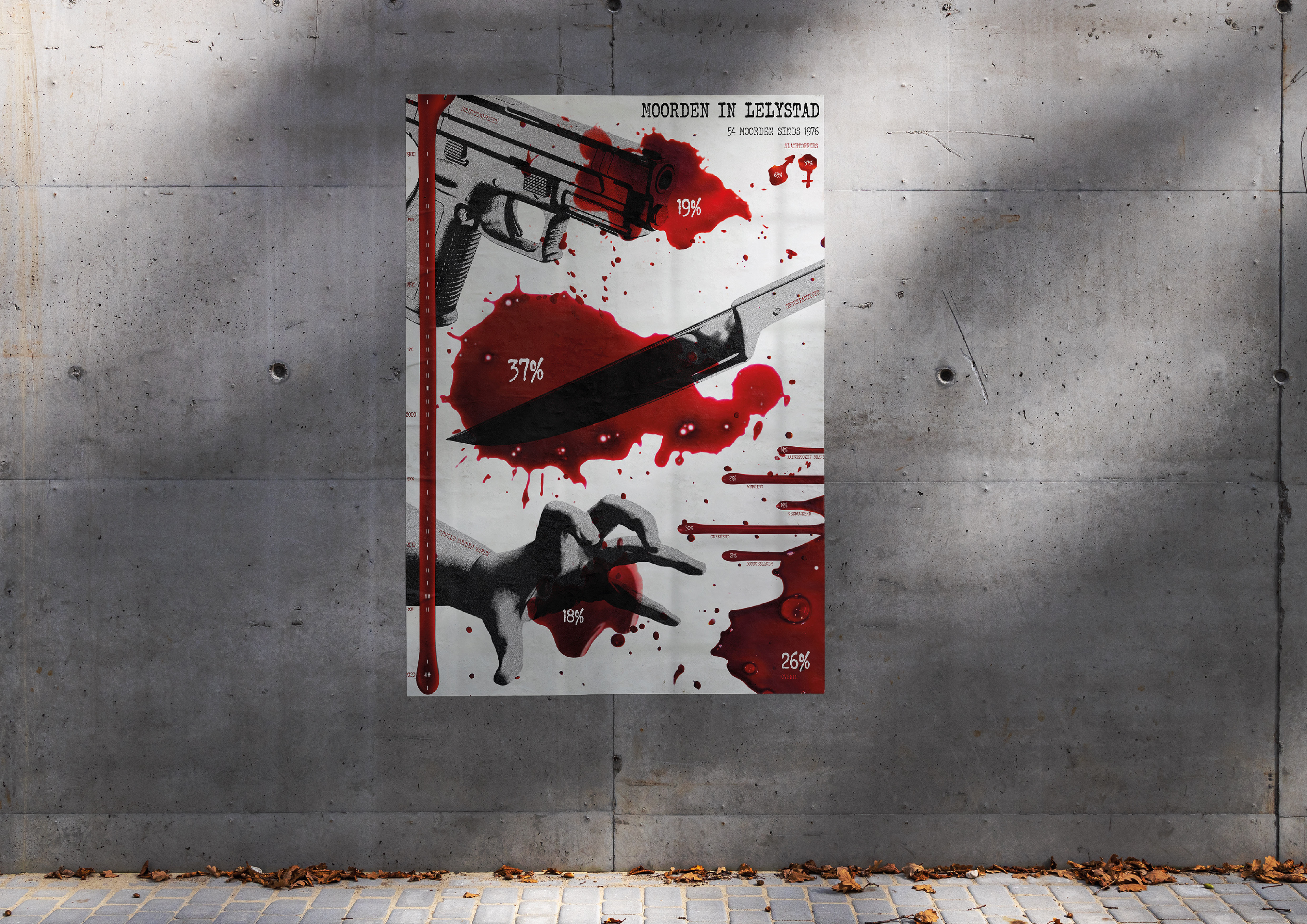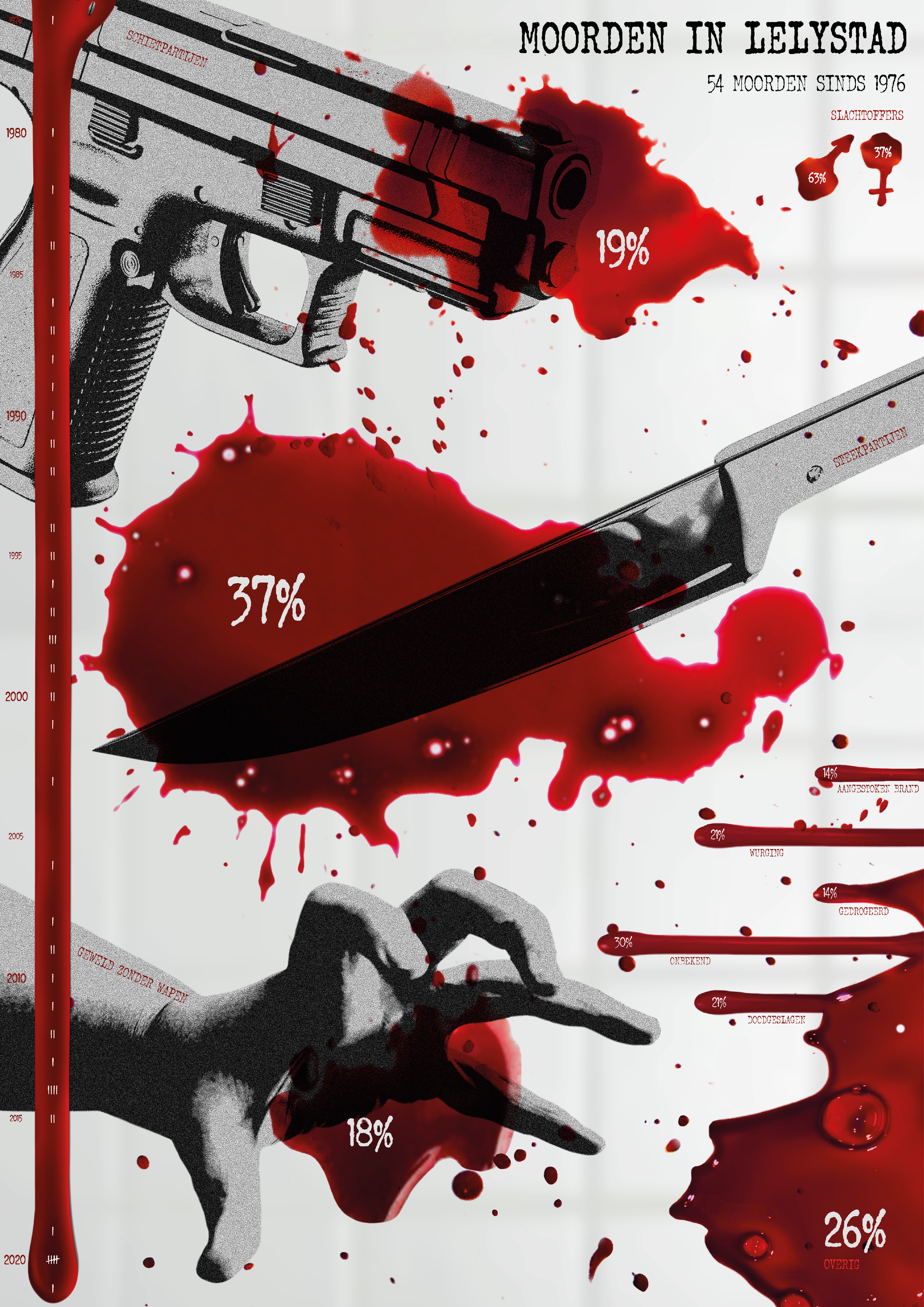 Een infographic over moorden die, sinds 1976, zijn gepleegd in Lelystad. Deze werkt op afstand, maar geeft meer gedetailleerde informatie naarmate de kijker dichterbij komt.