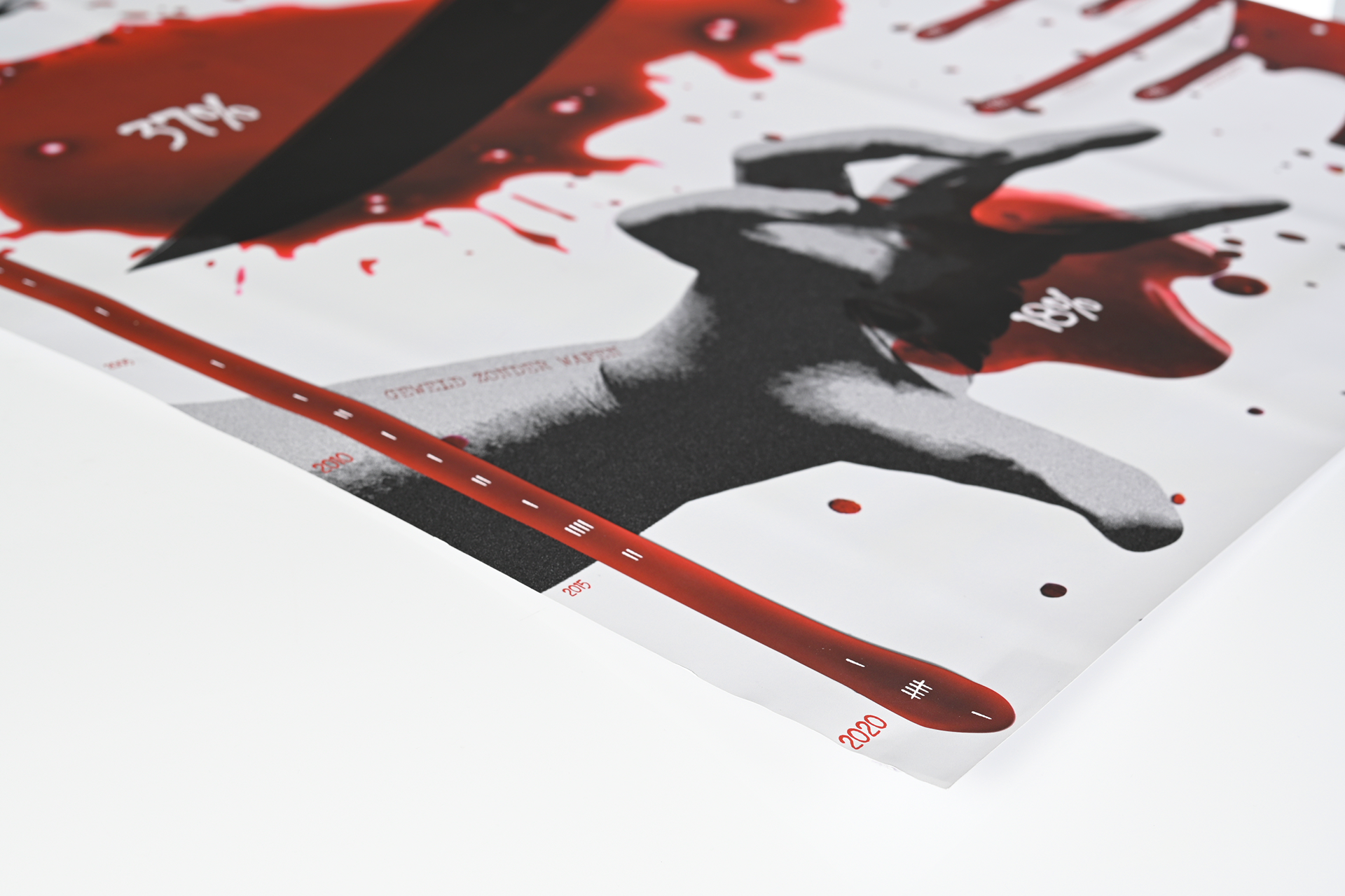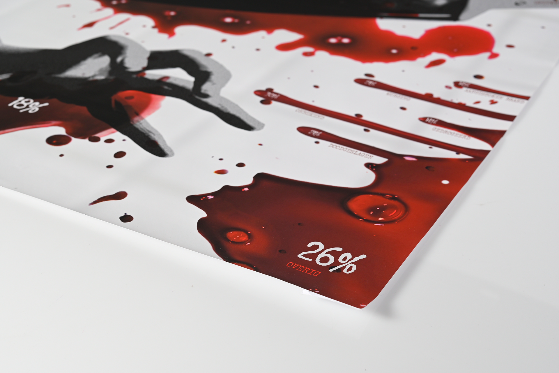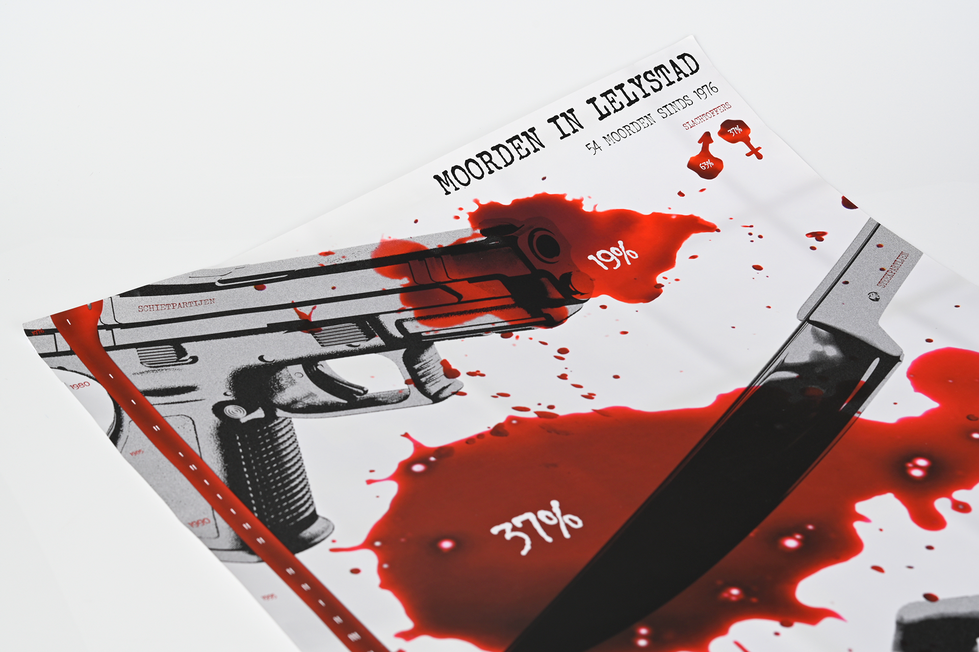 Een infographic over moorden die, sinds 1976, zijn gepleegd in Lelystad. Deze werkt op afstand, maar geeft meer gedetailleerde informatie naarmate de kijker dichterbij komt.