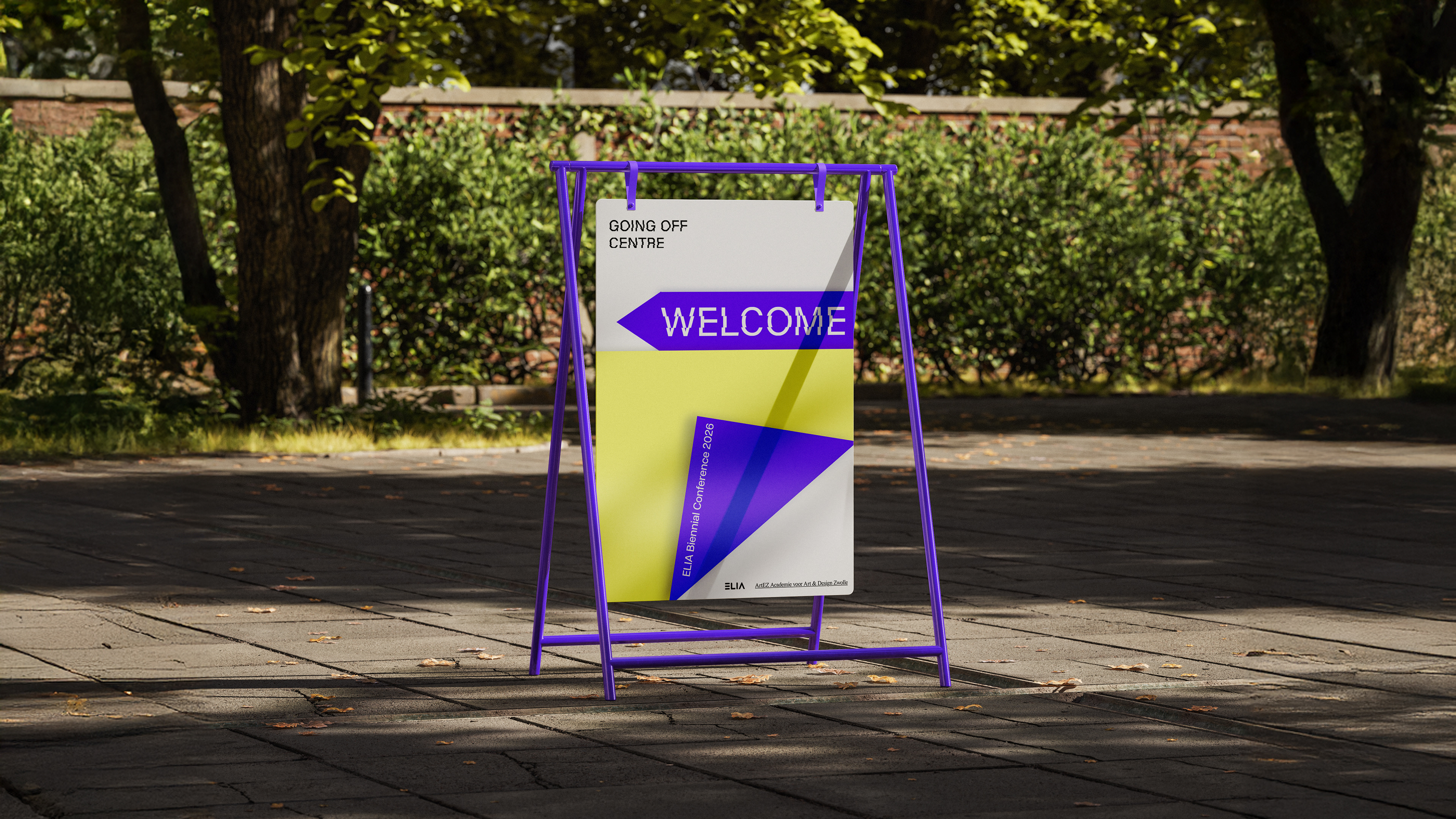 November 2026 organiseert ArtEZ University of the Arts in Zwolle de 19e ELIA Biennial Conference, waar honderden kunstprofessionals uit Europa samenkomen om te sparren over de toekomst van het kunstonderwijs. De conferentie draait om verschuivende perspectieven en het ontdekken van nieuwe ideeën. Onder het thema “Going Off Centre” onderzoekt de conferentie wat er gebeurt wanneer we bewust buiten het midden stappen. Dit vormde de inspiratie bij het ontwikkelen van deze visuele identiteit.