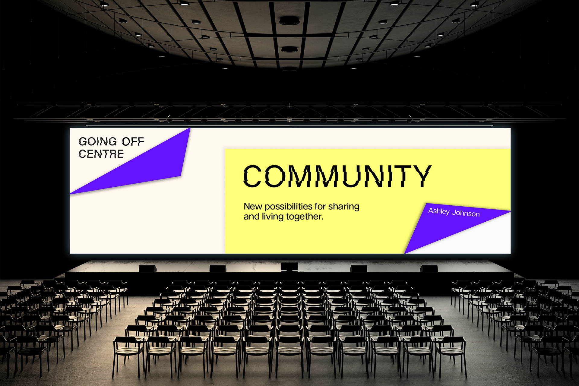 De basis is een custom ontworpen lettertype die de essentie van de conferentie vat; het wegstappen van het midden om nieuwe perspectieven te verkennen. Het laat zien wat er gebeurt wanneer de balans verschuift en wrijving ontstaat.